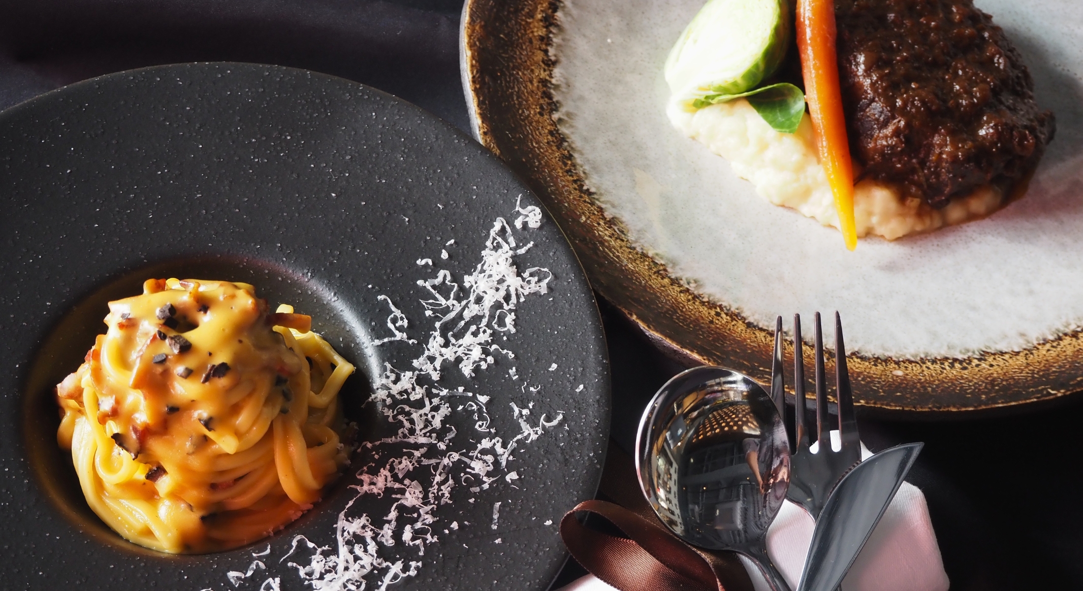 柔らかい「牛タンのブラサート」(赤ワイン煮込み)をメインに、和牛や天使海老を使った前菜のアソートプレートから、トリュフ香る濃厚なカルボナーラなど全4皿をご堪能ください。