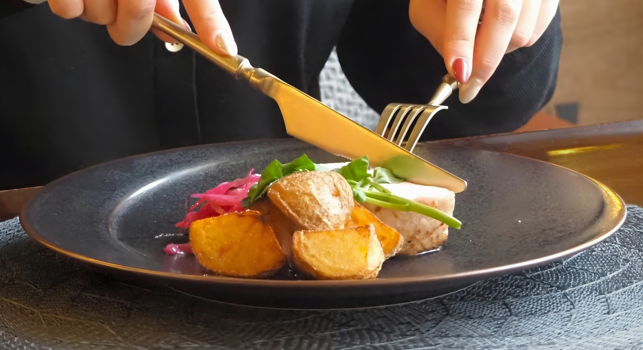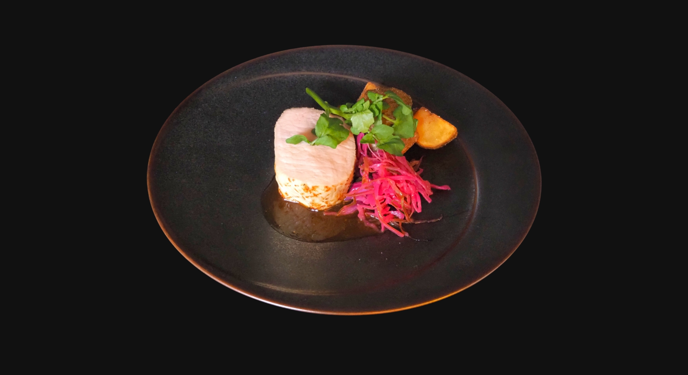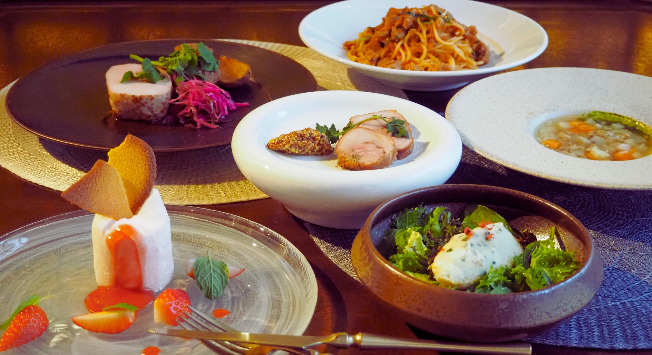 ディナーコースは、鹿児島県のブランド豚「チャーミートン」をメインに据えた全6品。カテキンを含むお茶などの飼料で育てられた、臭みのない豚肉を、しっとりジューシーなローストポークに仕上げました。