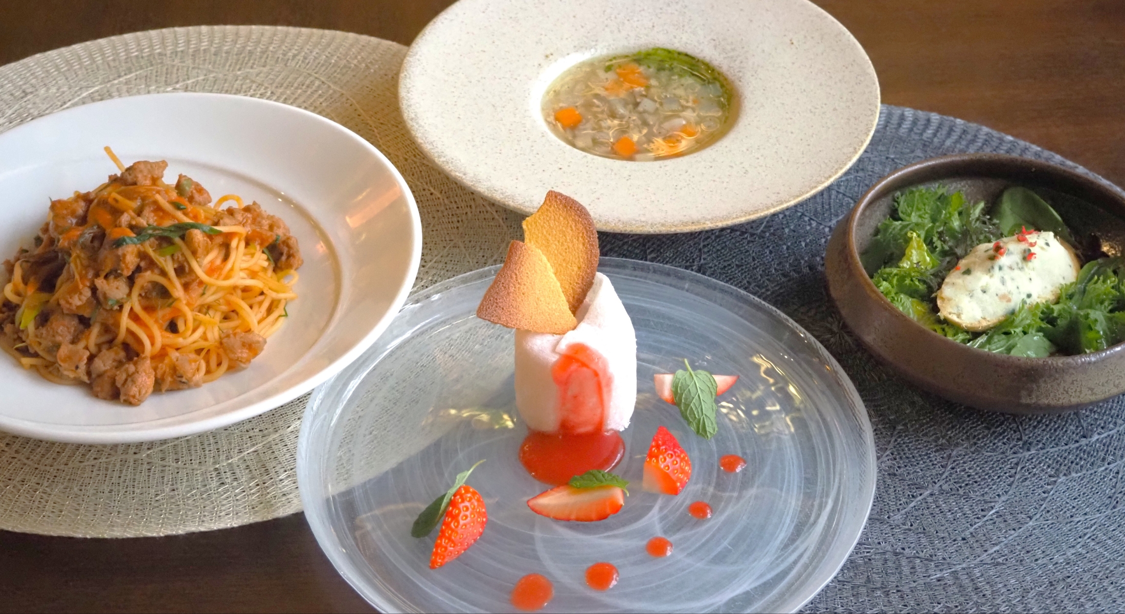 4品のランチコースでは、タラのうま味を引き出した前菜をはじめ、トマトを使わないビアンコベースのスープや、イタリアのソーセージ・サルシッチャと甘みを増した九条ネギのパスタなど、旬の味覚を存分にお楽しみいただけます。