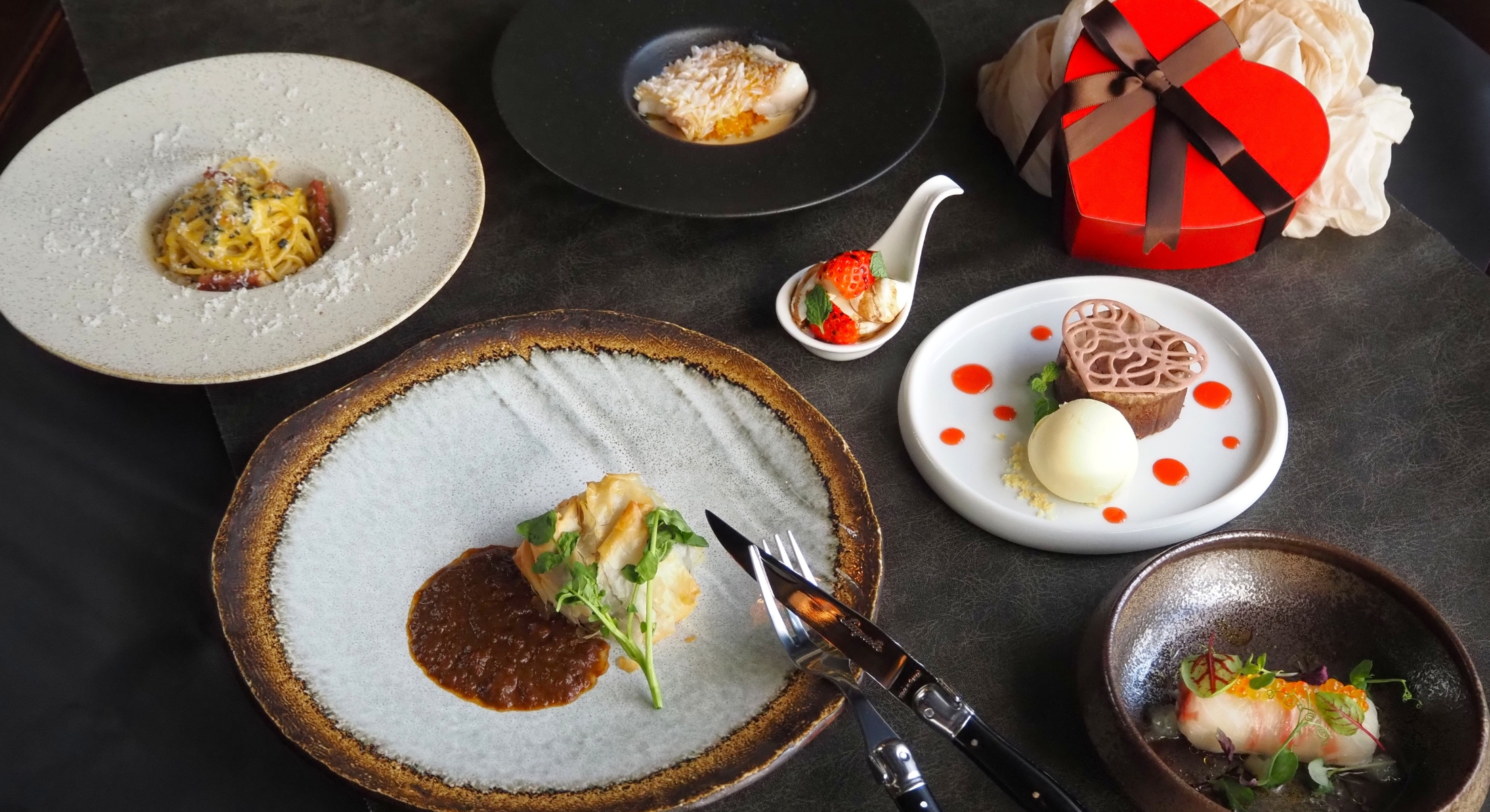 トリュフの芳醇な香りが広がるカルボナーラや、お焦げリゾットとともに味わう魚料理、バレンタインにかかせないショコラデザートなど、食感と香りのコントラストを意識した一皿一皿をお楽しみいただけます。